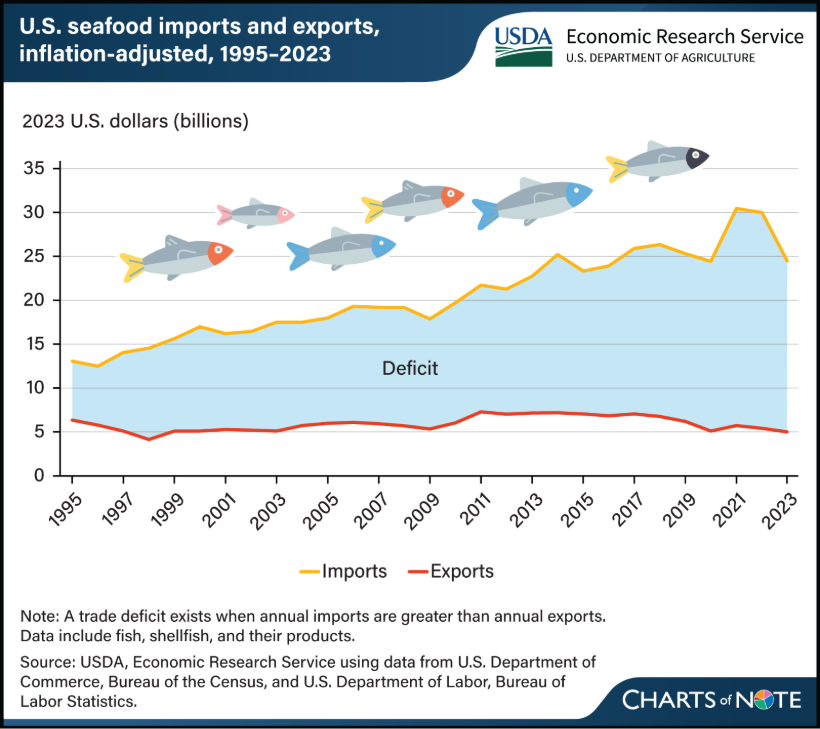 - Resilient domestic food industry: Another set of reasons I heard for investment in the cultured protein industry was the importance of developing and maintaining a domestic food industry. First, the U.S. imports about 80% of the seafood we consume annually (see chart above). Second, American beef cattle herd sizes are tied to drought conditions, with the Farm Bureau reporting that 2024’s cattle herd size was the smallest in 73 years, which is one of the drivers of high beef prices in the U.S. And third, China is increasingly investing in the new cultured meat technologies, so developing a home-grown industry could be important.